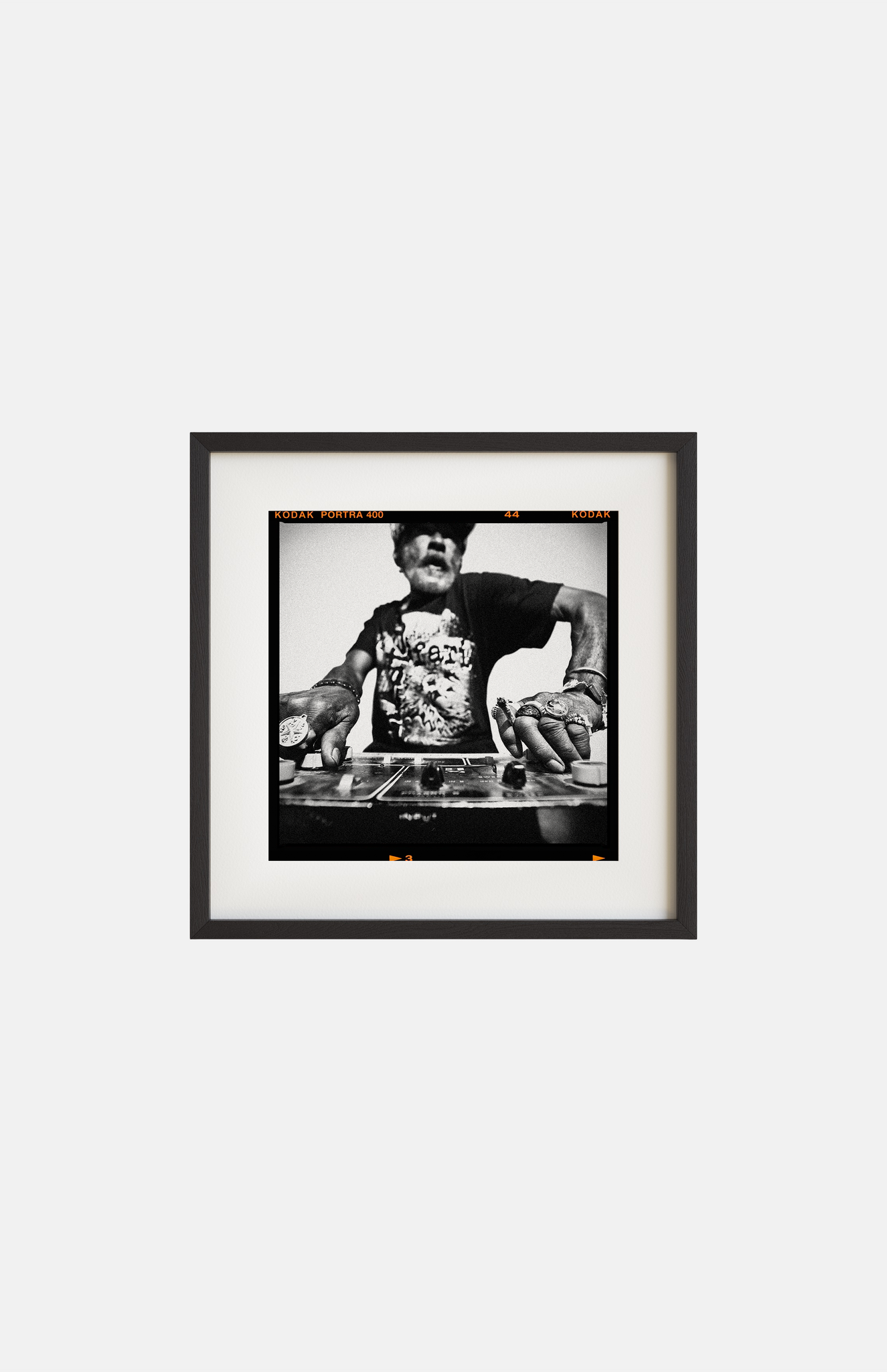 This framed archival print captures legendary producer and dub pioneer Lee “Scratch” Perry. Shot on Kodak Portra 400 film, the image is presented with its original contact sheet markings intact. Printed on premium giclée stock and housed in a black wood frame.